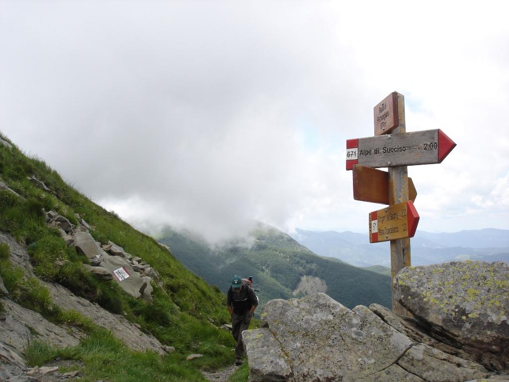 Da qui il sentiero sale per tornanti fino al passo di Pietratagliata 1750m. nel mezzo tra Monte Alto e l’Alpe di Succiso. Proseguiamo girando a destra sempre sul sentiero 671, che prima con un percorso più impegnativo, ci fa superare un tratto di cresta rocciosa messa in sicurezza con cavi d’acciaio e una staffa (sentiero attrezzato EEA) e poi con un tranquillo sentiero in costante salita che segue in grosso modo la cresta, ci porta in vetta all’ Alpe di Succiso 2017, da dove si ha un bel panorama a 360°.