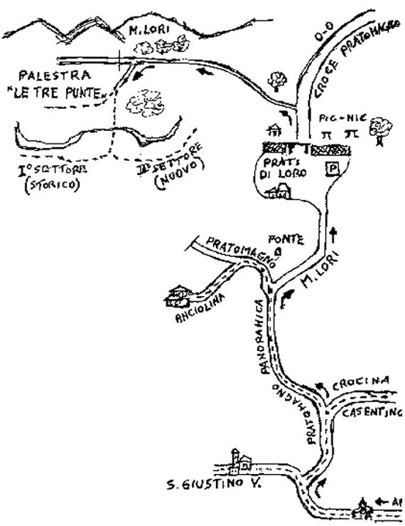 Arrampicata La falesia "Tre punte" a Monte Lori ( Pratomagno - Loro di Ciuffenna ) si trova a un' altitudine di 1560m, è esposta a sud, riparata dai venti freddi, ottima in inverno e mezze stagioni, sconsigliabile d’estate, questa falesia non è da sottovalutare data la rotondità degli appigli, a prima vista molto belli. Adatta ad arrampicatori medi specie nel secondo settore, in espansione. La palestra è divisa in due settori. Fare molta attenzione data la forte esposizione e la presenza di erba e muschio sulle cenge, specie dopo la pioggia!!