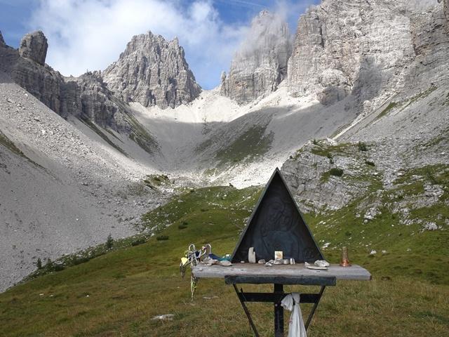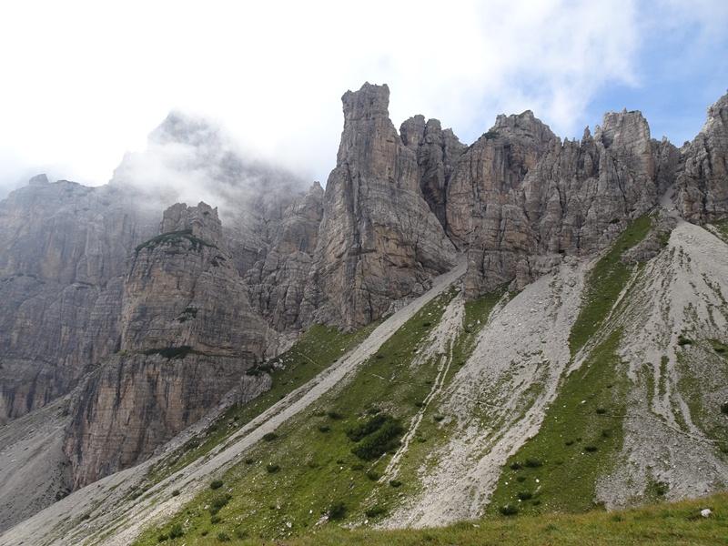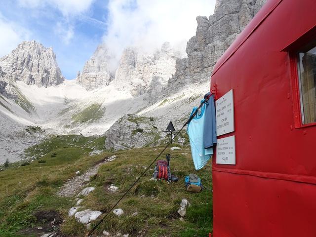 Poi il sentiero procede su ampi zig zag fino ad arrivare sui 1900m ai piedi del Campanile di Val Montanaia e continua con forte pendenza fino ad uscire nel prato dove si trova il Bivacco Perugini 2060 m.