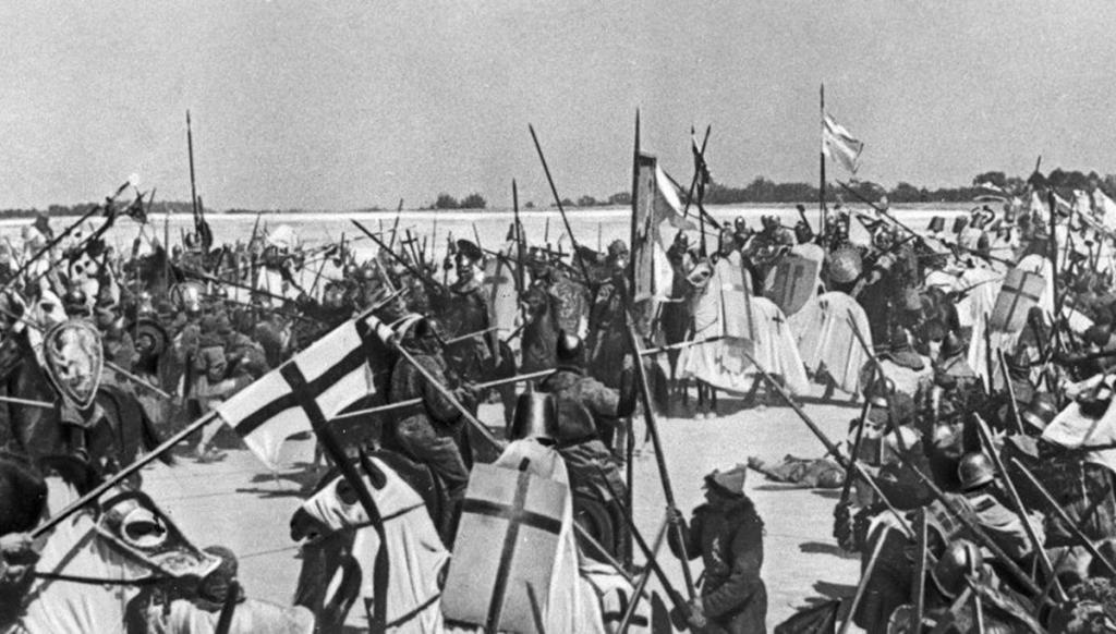 Sergej Ėjzenštejn prese come soggetto del film la Battaglia del lago ghiacciato, durante la quale Aleksandr, capo dell'esercito russo, sconfigge l'esercito teutonico nel 1242 presso il Lago dei Ciudi ai confini dell'odierna Estonia. Secondo la leggenda Aleksandr diede ordine ai propri cavalieri di combattere privi di armature e di condurre i nemici sulla sottile superficie ghiacciata del lago, nel quale i cavalieri teutonici sprofondarono sotto il peso delle proprie bardature metalliche.
