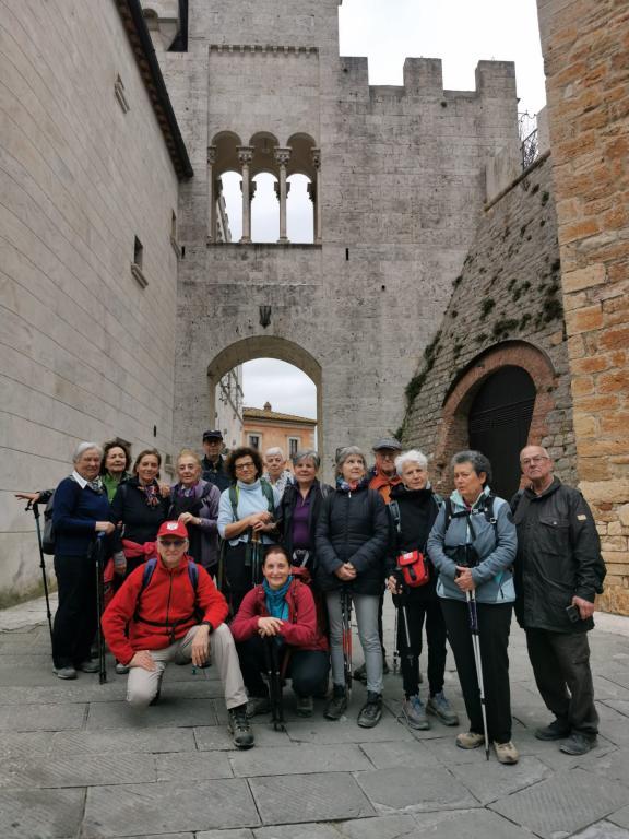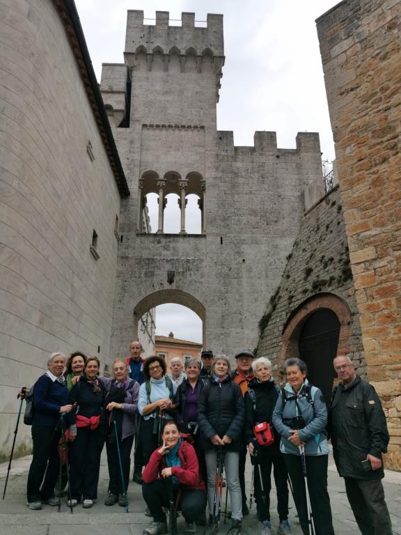 Escursionisti Bell'anello che parte dal borgo medievale di Serre di Rapolano. Il percorso si snoda poi tra oliveti, vigneti e vari laghetti e stagni passando anche per il borgo di S. Gimignanello.